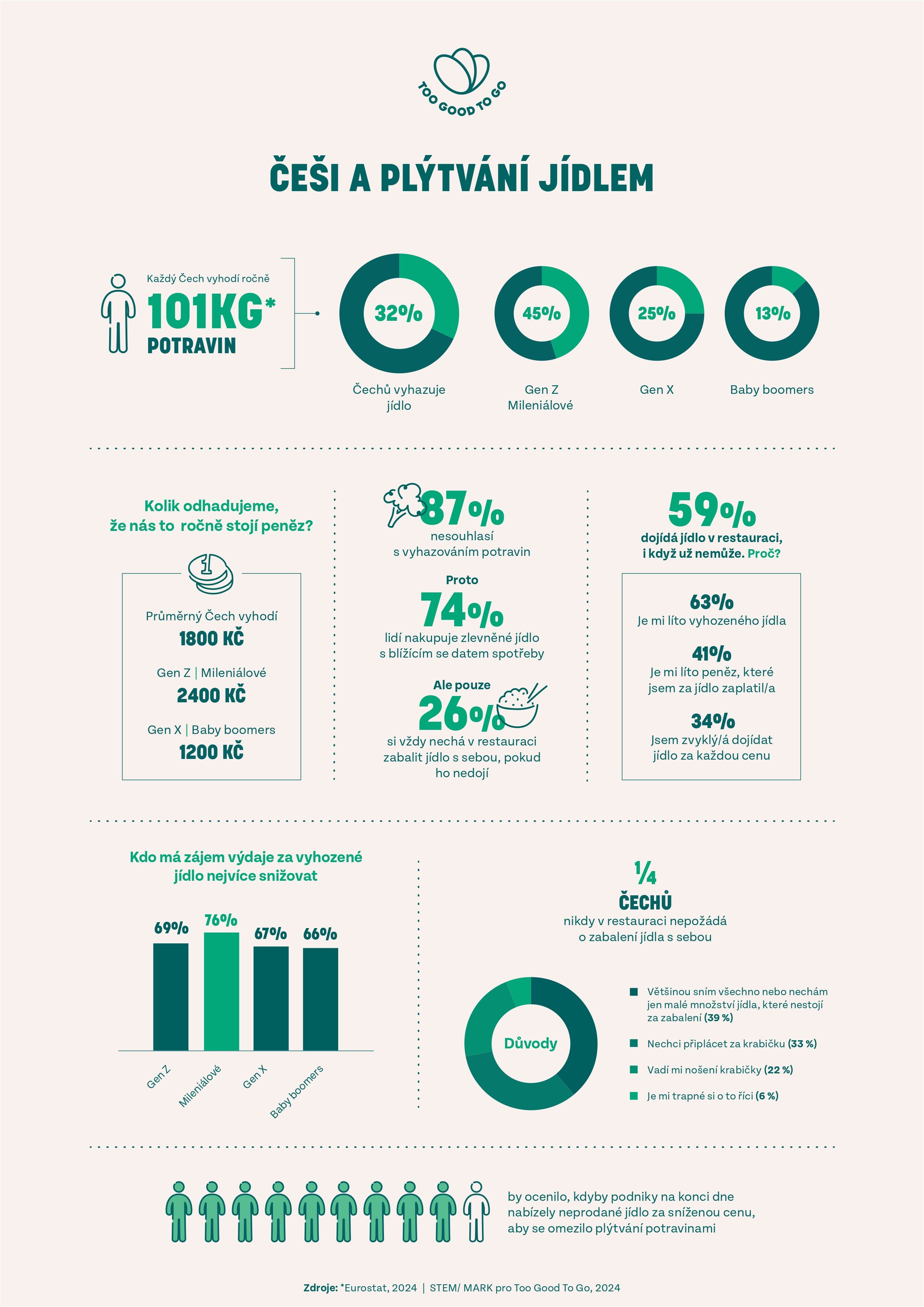 Too Good To Go, ve spolupráci s výzkumnou agenturou STEM/MARK odhalila překvapivé generační rozdíly v tom, jak Češi nakládají s potravinovým odpadem. Generace Z a mileniálové nejenže za jídlo více utrácejí, ale také více plýtvají, zatímco baby boomers zaujímají úspornější přístup. Mladší generace však vykazují větší ochotu změnit své návyky a řešit globální problém plýtvání potravinami. Tento průzkum navazuje na nedávné spuštění Too Good To Go v Česku, kde společnost pokračuje ve své misi snižovat plýtvání potravinami na celém světě.