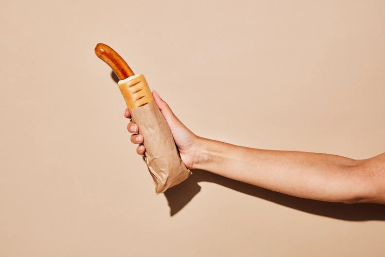 - Halver pølser og brød på langs.