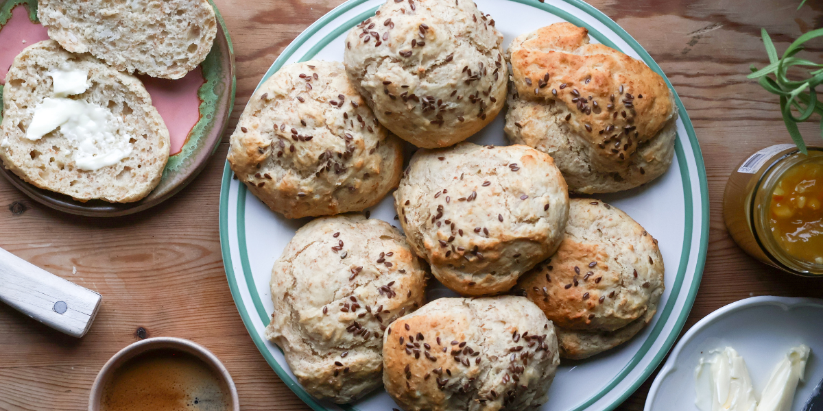 - Form bollerne med to spiseskeer og placer dem på en bageplade beklædt med bagepapir. Drys med hørfrø.