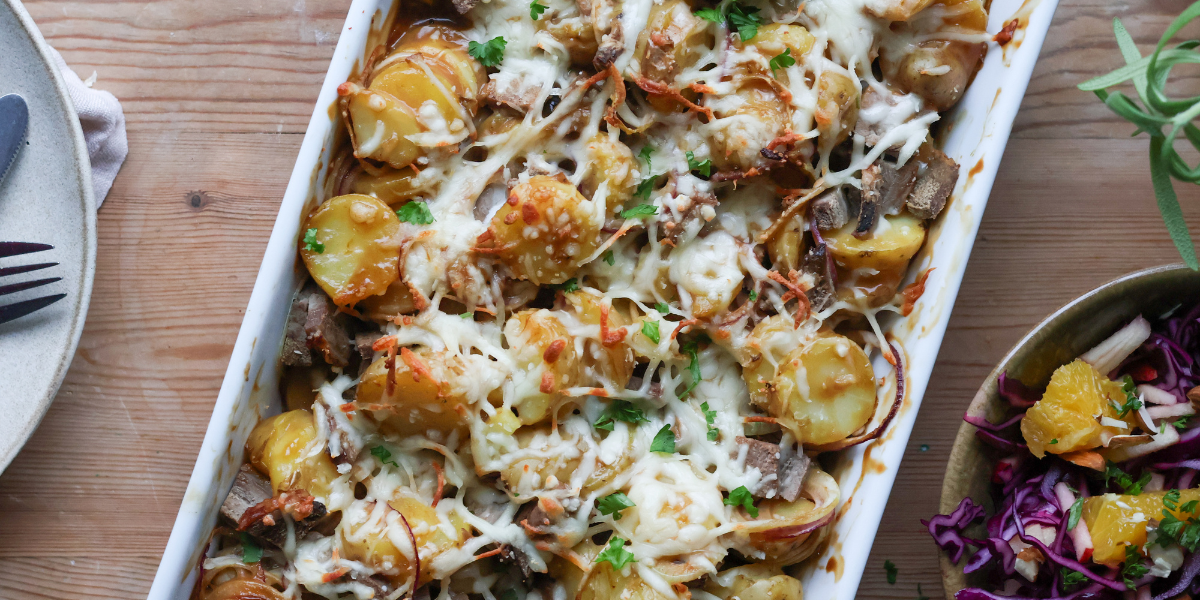 Har du kogte kartofler, and og brun sovs til overs fra julemiddagen? Så er denne kartoffelgratin den perfekte måde at samle julens bedste smage i én ret! Alt, du behøver ud over dine rester, er lidt mozzarella for at sætte prikken over i’et. Server med en rest af rødkålssalat for et lækkert måltid, der både smager fantastisk og mindsker madspild.