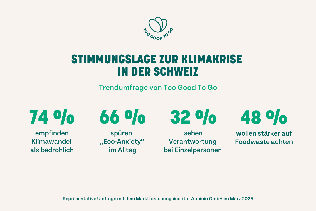 Die Klimakrise und wirtschaftliche Herausforderungen prägen das Stimmungsbild in der Schweiz schon länger. Seit kurzer Zeit tritt die Sorge vor globalen Unsicherheiten aber dominanter in Erscheinung. Bleibt da noch genug Aufmerksamkeit für den Kampf gegen die Klimakrise? Mit der klaren Mission, Foodwaste zu reduzieren für eine nachhaltige Umwelt, stellt Too Good To Go das Thema täglich in den Fokus. Aktuell mit einer repräsentativen Umfrage, die der Frage nachgeht, wie die Klimakrise den Alltag der Schweizer*innen beeinflusst. (Repräsentative Umfrage mit dem Marktforschungsinstitut Appinio GmbH im März 2025 unter 500 Schweizer*innen) Die Umfrage verdeutlicht: Internationale Konflikte und Sicherheit, Inflation und Wirtschaft sowie Klimakrise und Umwelt sind die Themen, die die Schweizer*innen am stärksten beschäftigen. Sie zeigt aber auch, dass der Wille da ist, aktiv etwas gegen die Klimakrise zu leisten.