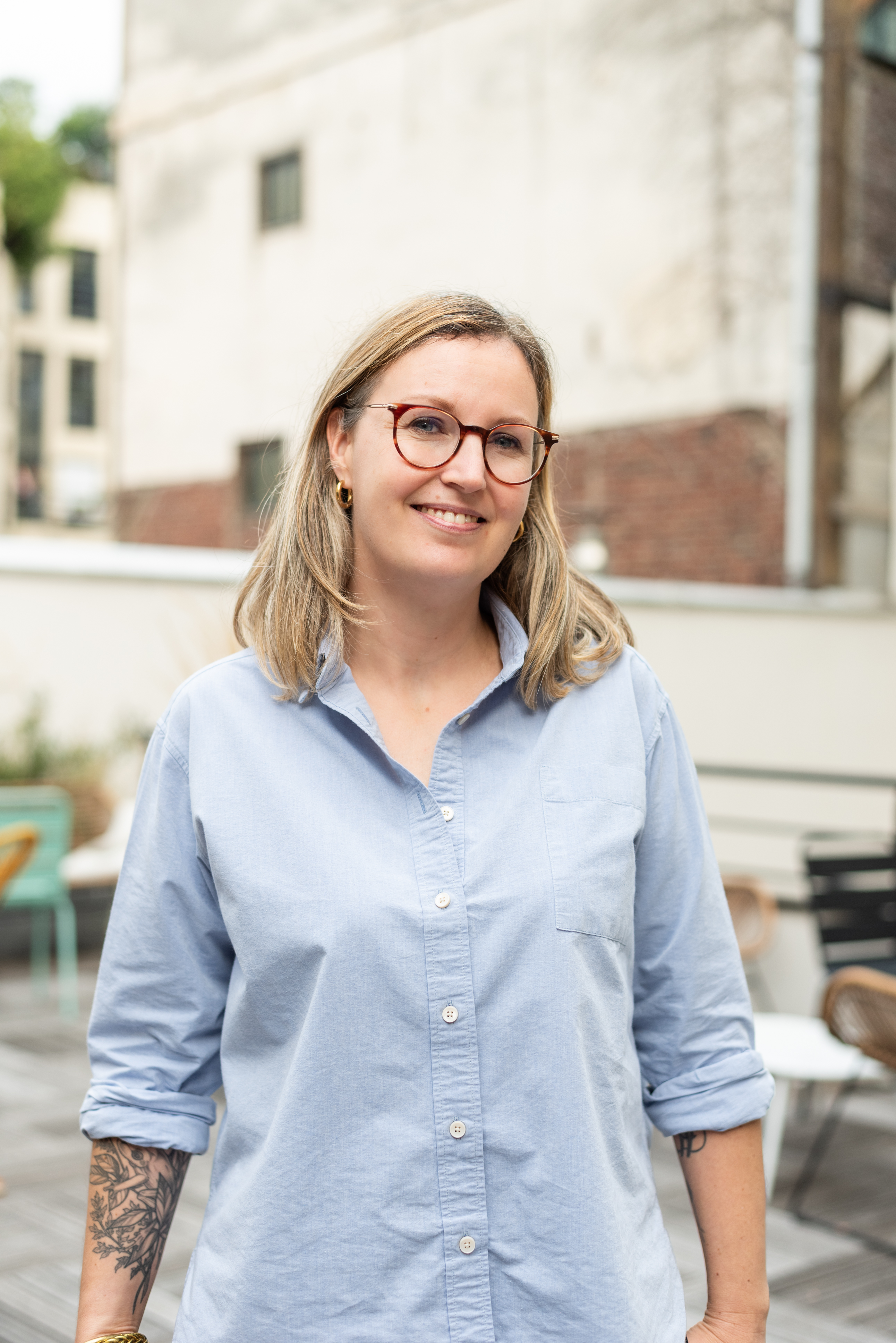 a woman wearing glasses and a blue shirt smiles for the camera