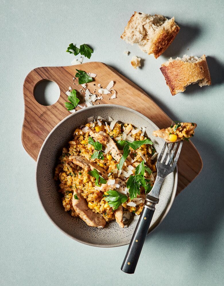 - Voeg de maïs, parmezaanse kaas, peterselie en ei toe en laat sudderen. Voeg de kip weer toe en roer totdat alles goed verhit is.