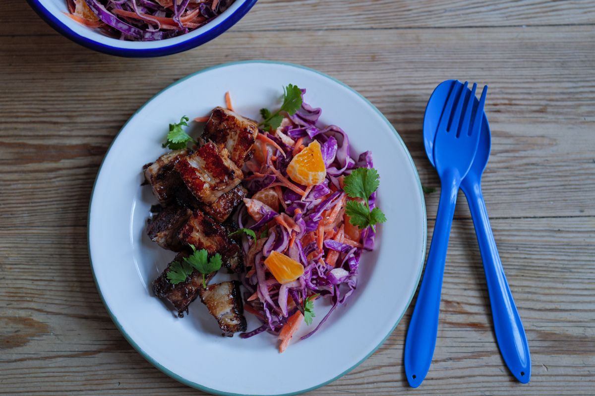 Glaserte ribbebiter med asiatisk coleslaw og klementin