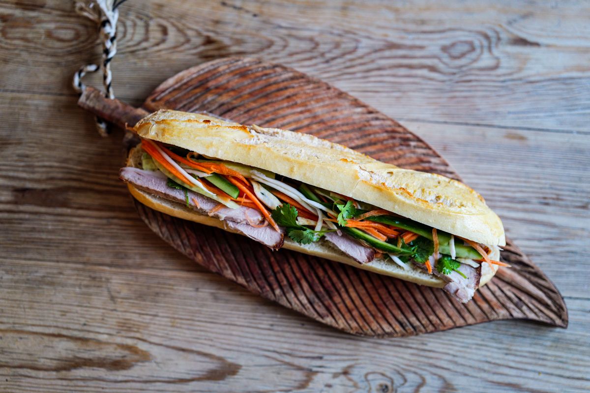 Snitt vårløk og chili. Bland med majones. Press limesaft over. Skjær et snitt i baguetten og smør et tykt lag med majonesblandingen. Legg skiver av ribbe på majonesen før du topper med masse syltede grønnsaker.