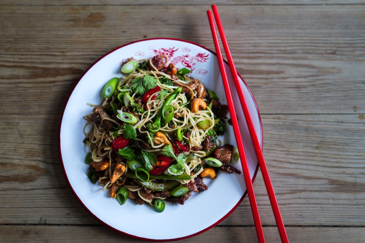 Tilsett brokkolini og beveg pannen. Hell over sesamolje, fiskesaus, soyasaus (vanlig og søt). Bland inn nudlene forsiktig og strø over vårløk, nøtter og chili. Pynt med koriander. Server med en gang.