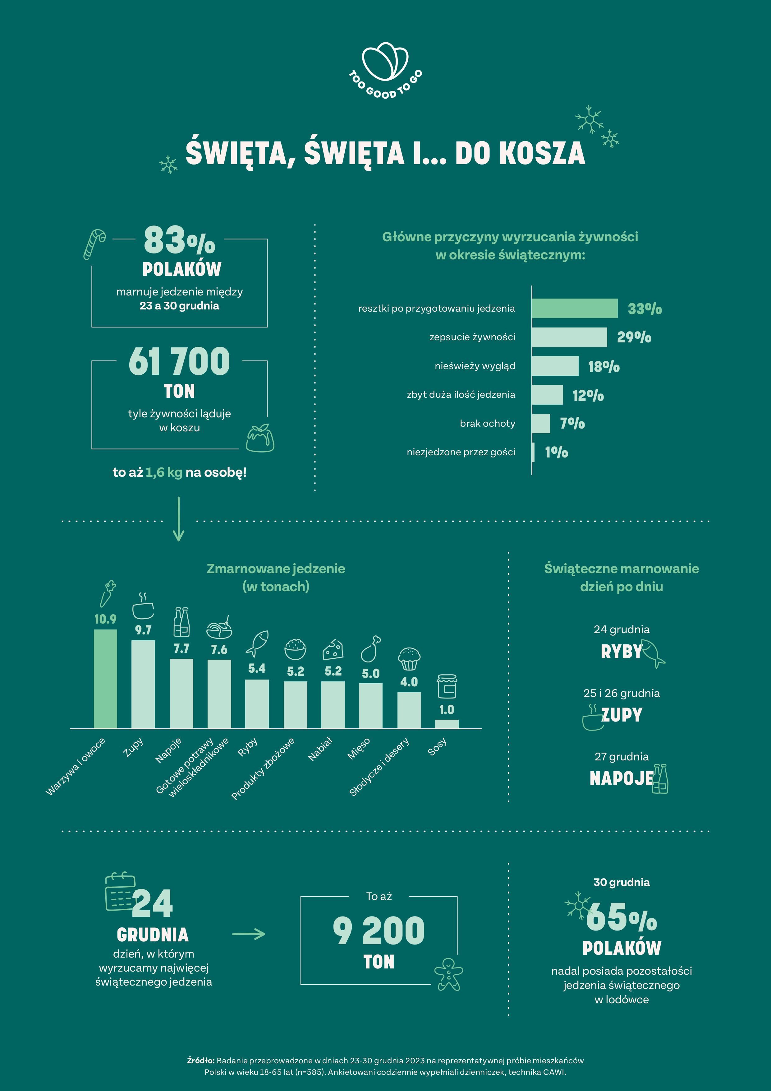 Badanie zrealizowane zostało na zlecenie Too Good To Go, firmy działającej na rzecz ograniczania marnowania żywności, przez Opinia24 w dniach 23-30 grudnia 2023 roku na reprezentatywnej grupie 585 Polaków w wieku 18-65 lat. Respondenci każdego dnia prowadzili dziennik, w którym odnotowywali wagę wyrzucanej żywności w podziale na 10 kategorii wraz z określeniem powodów wyrzucenia.
