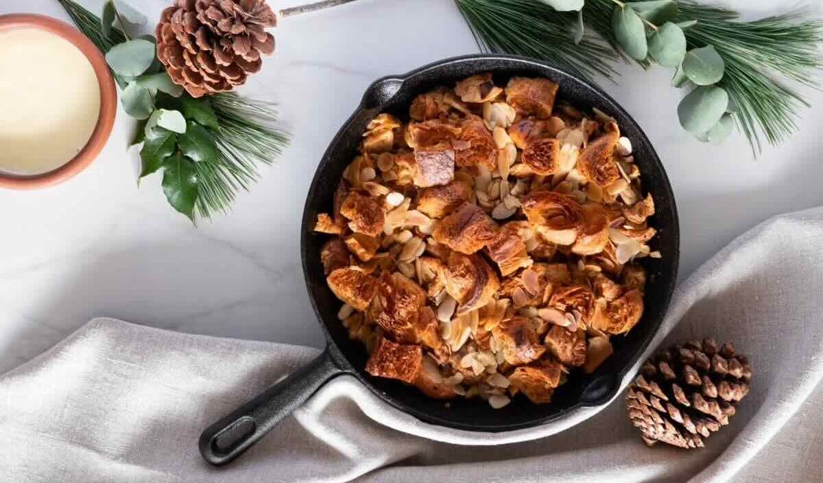 Aproveita pão ou croissants do dia anterior para preparar este pudim reconfortante, ideal para a época festiva.