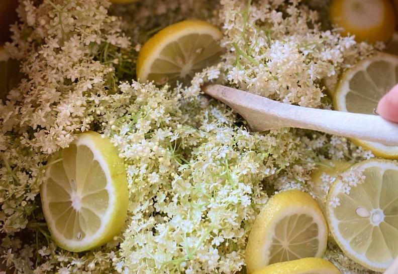- Koka upp vatten och socker och rör om så sockret löser sig. Blanda ner citronsyran och häll den heta sockerlagen i bunken med flädern och citronerna.